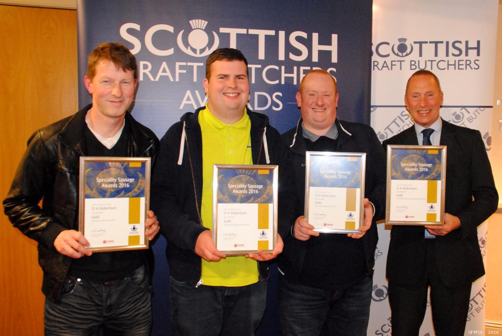The team from Kinnaird Butcher Shop & Deli pictured with their Gold and Silver Awards, from left, Stewart Fotheringham, Joshua Buchanan, Ryan Powell and Karl Heaton