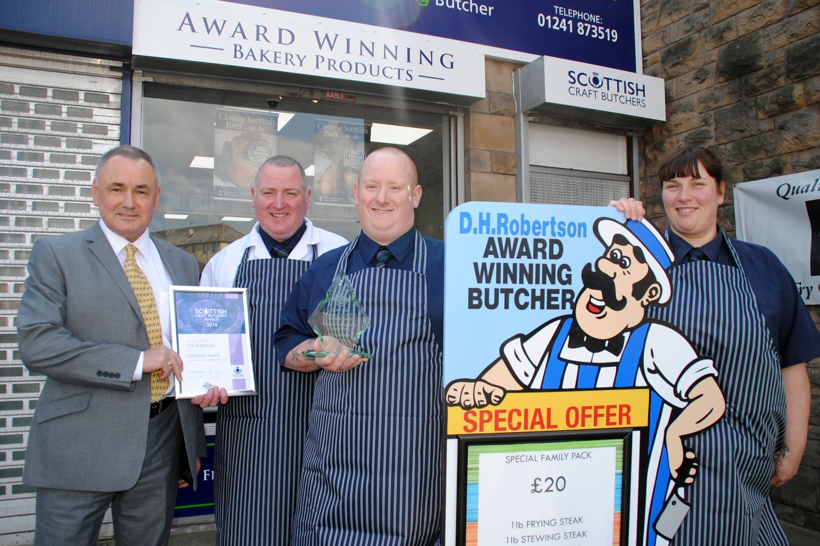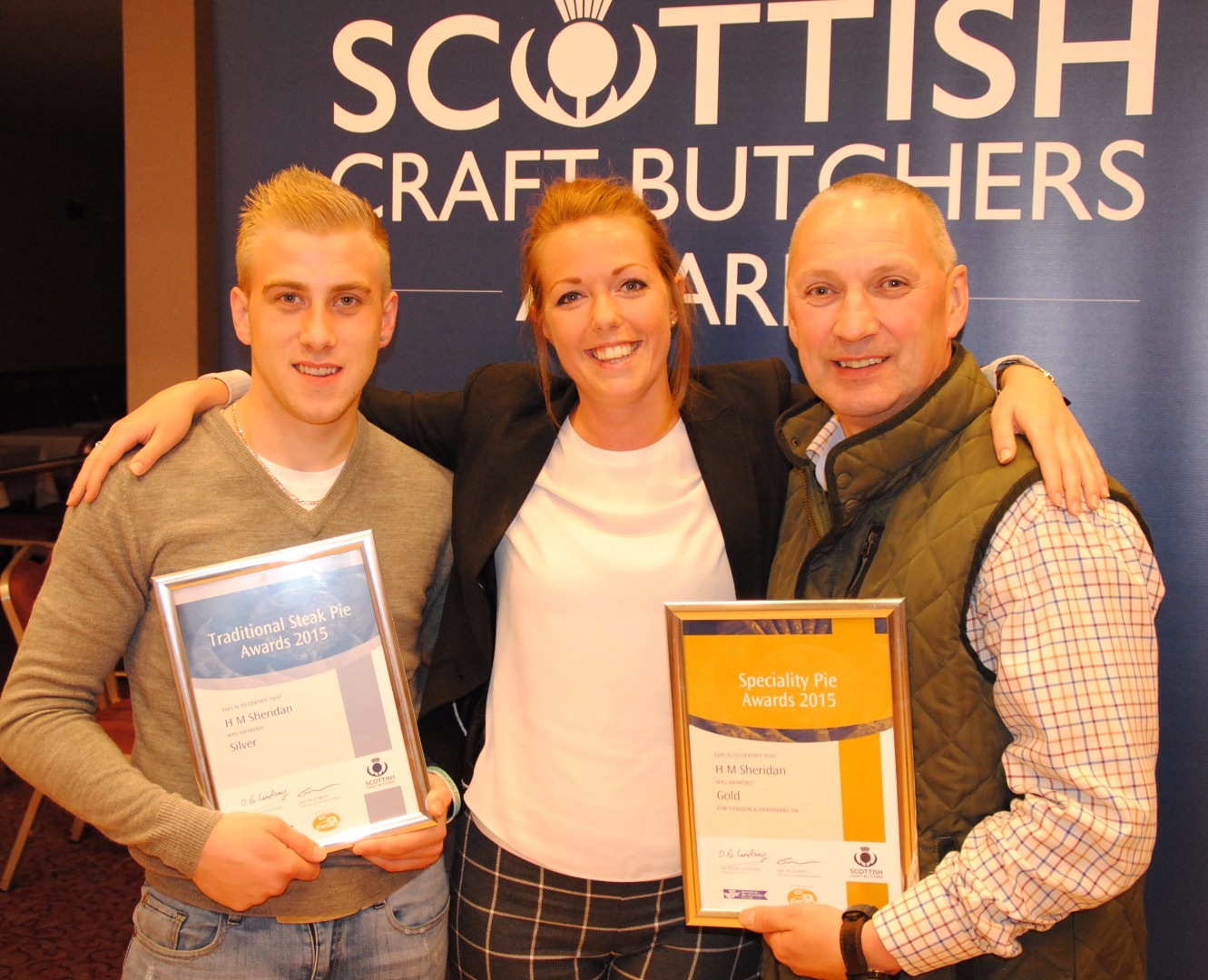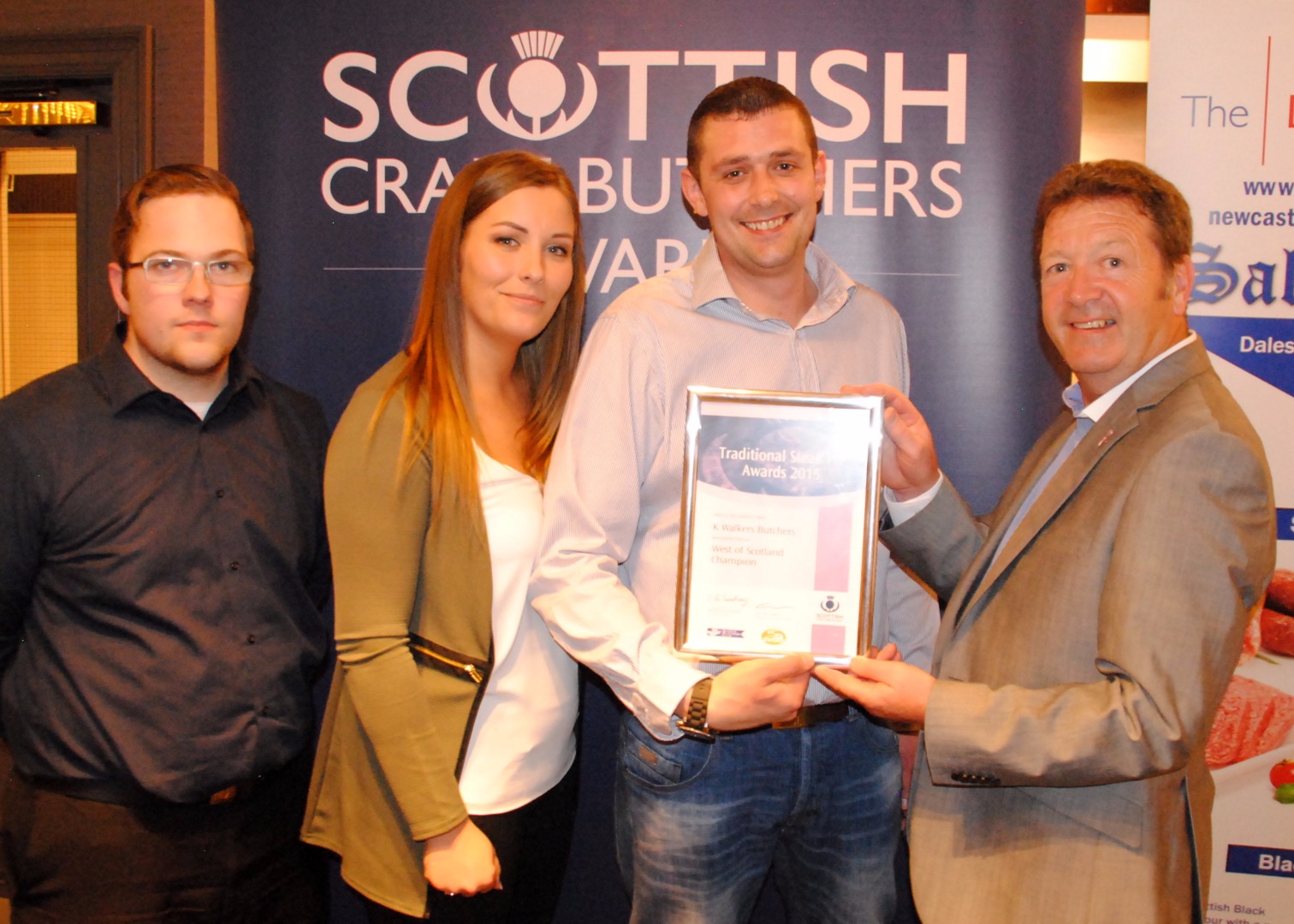Robert Watson (left) from sponsors Dalziels pictured presenting Elaine McKirdy and Kevin Gibson from Linton Butchers with their Gold Award