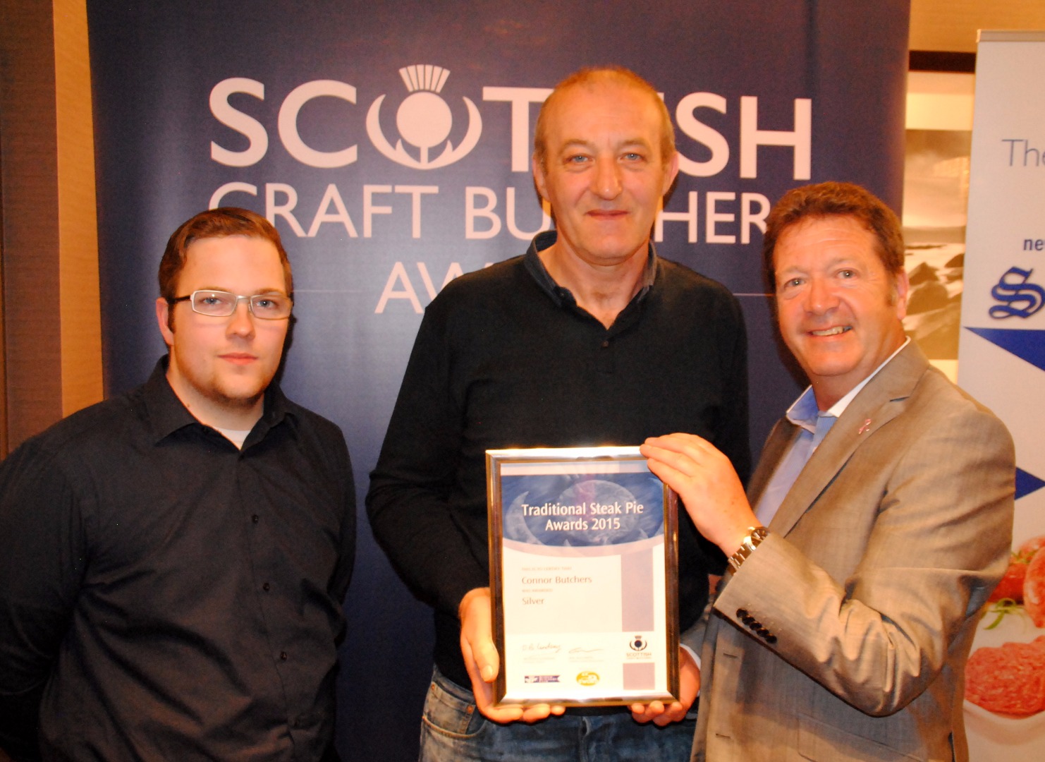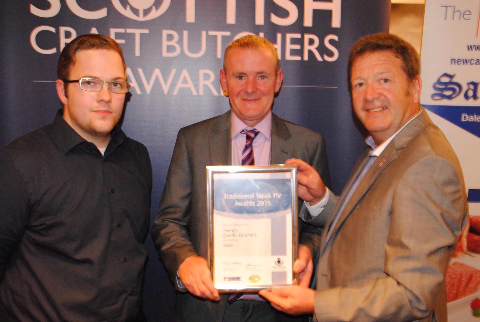 Robert Watson (left) from sponsors Dalziels pictred presenting James Pringle and Levi Carr from James Pringle Butchers with their Silver Award.
